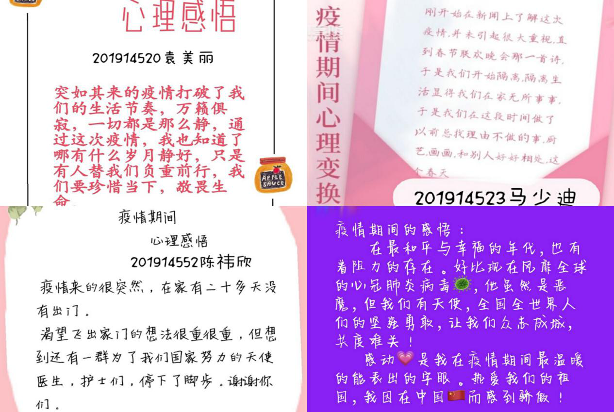 以“心路历程”为主题的文艺作品,主要展现了疫情期间大家各自不同的心理感悟,包含了海报、漫画、视频、音频等多种多样的形式。这次活动全院同学们踊跃参加活动,各年级员工创作的文艺作品,形式各异,内容丰富,感情真挚,既是对自我心路历程的回顾,也是无私的交流分享。同学们通过文艺作品方式展现了自身在疫情期间内心的变化、情绪的调整、生活学习方式的改变以及当下他们真实的心境。