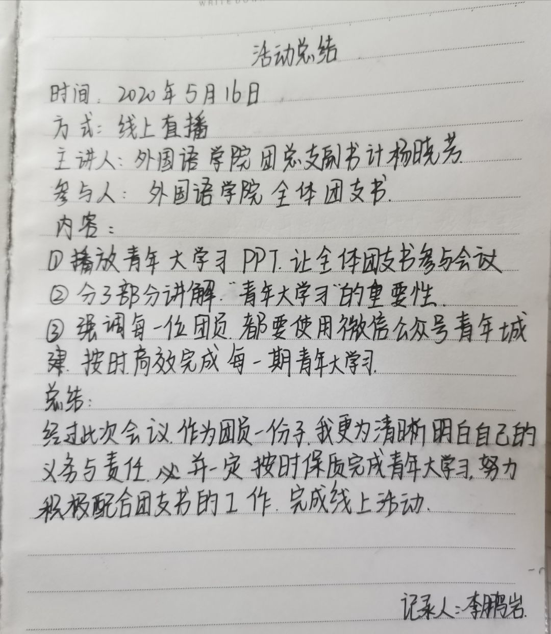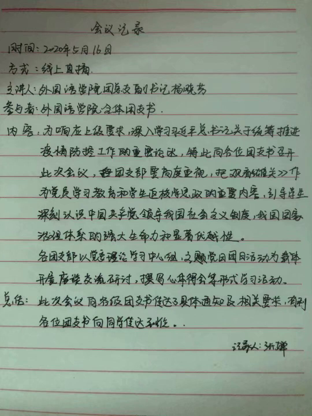 活动采用线上直播的方式,主持人杨晓芳首先组织全体团支书观看“青年大学习”PPT课件,分三部分着重论述“青年大学习”的重要性及其系统的更新内容。她强调每位团支书要提高认识,严格落实工作安排,督促支部团员使用微信公众号“青年城建”按时高效完成每一次青年大学习。此外,各位团支书就“青年大学习”工作开展情况相互交流经验;最后杨晓芳对此次会议进行了总结。本次会议全体团支书认真配合,他们表示要从意识层面提高认识,高度重视政治学习,并传达给本支部的所有团员;同时创新工作方式方法,更加高效地完成任务。