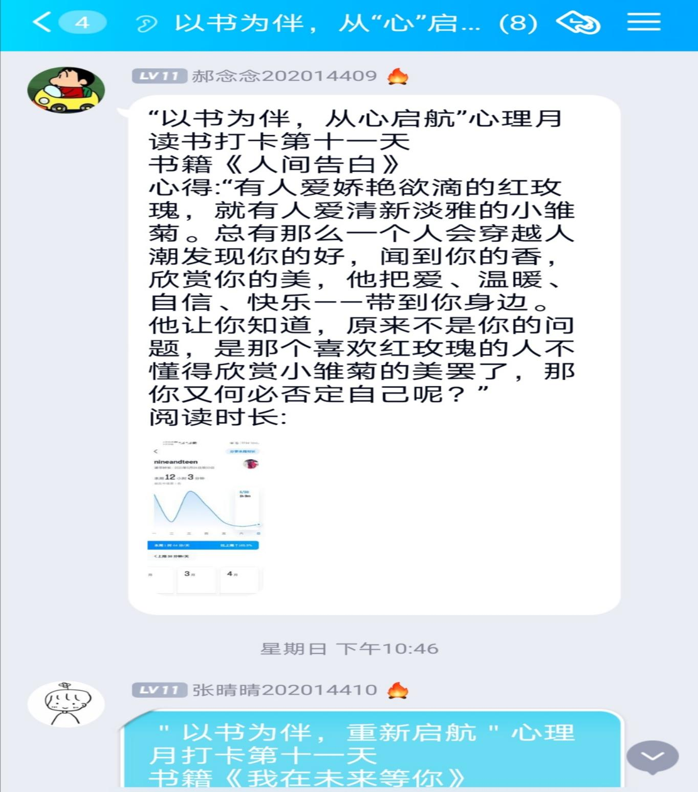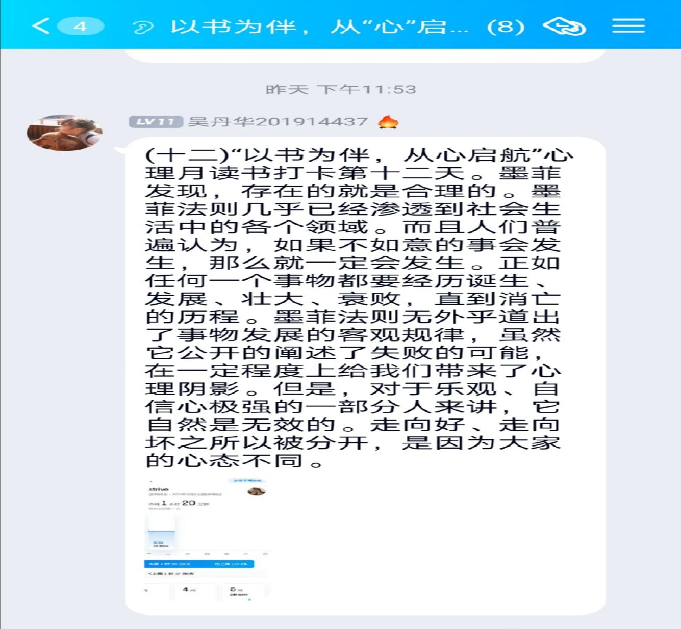 本次读书打卡活动宣传和普及了老员工心理学知识,增强了同学们的心理保健意识,提高了同学们的心理素质和自我调适能力,进一步展现同学们的心理健康能量。