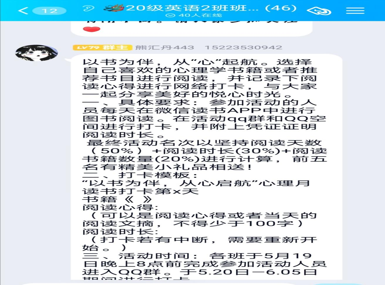 从5月20日起,同学们每天阅读自己喜欢的心理类书籍,每天只能在qq打卡群分享自己的阅读感受和心得体会。通过qq打卡活动,同学们既扩充了知识量,又缓解了由于压力而造成的紧张情绪。