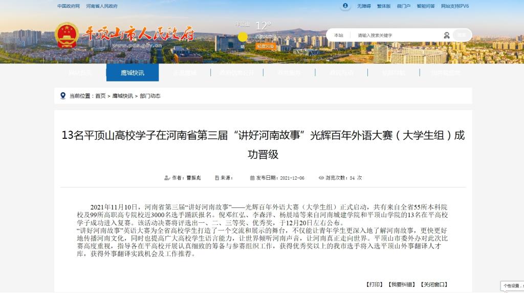 此次大赛以“光辉百年”为主题,旨在向建党百年华诞献礼,用外语分享感动,传播正能量。自报名程序启动以来,共有来自全省55所本科院校及99所高职高专院校近3000名选手报名参加。针对此次活动,bv伟德国际1946高度重视,认真筹备、积极组织,并选派英语专业教师从中英文讲稿、语音语调、幻灯片制作、视频录制等各个方面对每位参赛选手进行全方位一对一指导。经过线上初赛、复赛以及全省总决赛等环节,公司共有11名同学入围复赛(在平高校共有13名员工进入复赛),多名同学在比赛中取得好成绩,充分展现了公司员工扎实的英语口语水平和良好的精神风貌。平顶山市人民政府网站对比赛结果给予了相关报道。