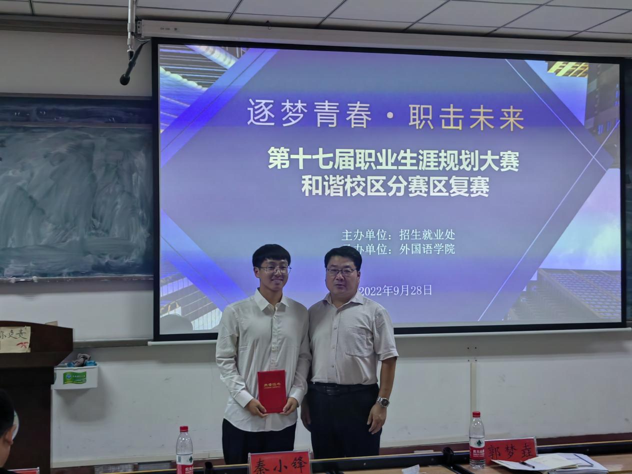大赛分别为书面作品评审和现场展示两个环节。书面作品包括职业生涯规划书和职业生涯人物访谈报告;现场展示环节包括5分钟的PPT展示、3分钟的现场答辩和4分钟的职业角色情景模拟。参赛选手根据抽签顺序依次进行展示,精彩表现赢得观众的阵阵掌声。经过激烈比拼,最终产生一等奖1名,二等奖2名,三等奖4人,秦小锋为获奖选手颁奖并合影留念。