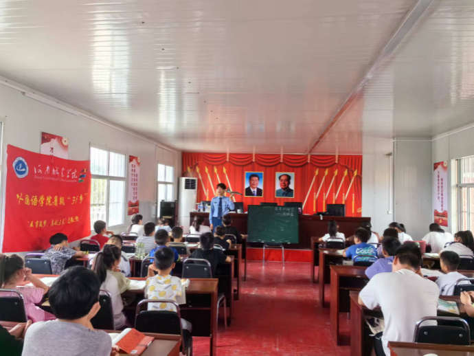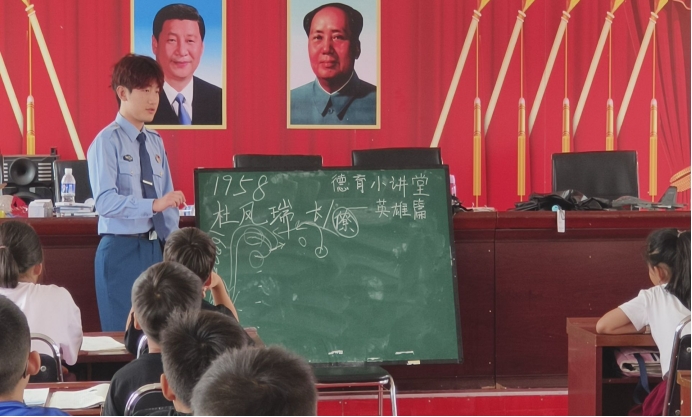 本次支教活动围绕德育、智育、体育、美育和劳动实践开展。其中德育小讲堂主讲人由支教团成员2022级员工周浩宇担任,该生曾服役于东部战区94833部队。在课堂上,他以自身服役经历为鲜活教材向小朋友们展示部队生活,并生动地讲解英雄人物杜凤瑞事迹,引导小朋友们向英雄致敬,自觉传承红色基因。
