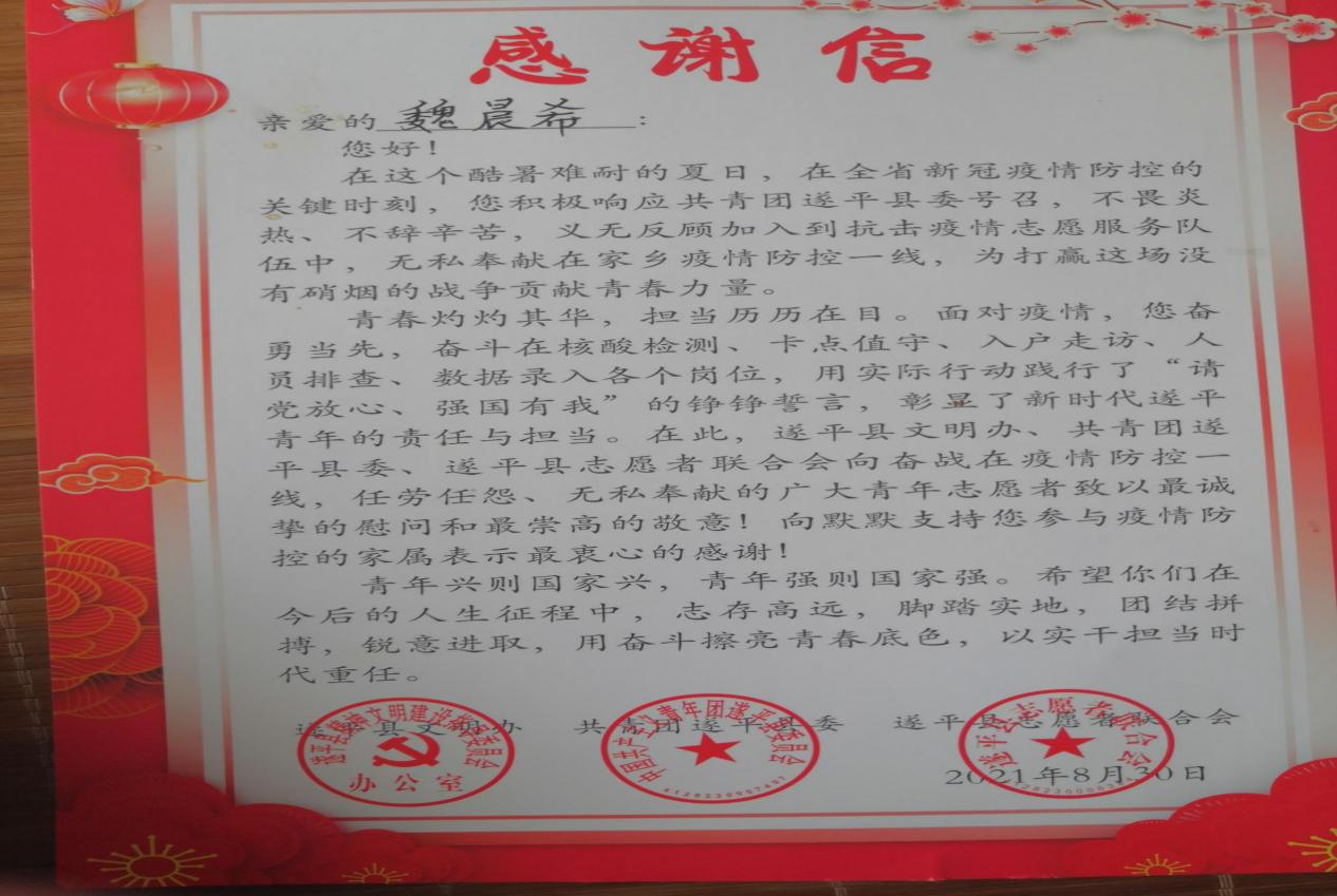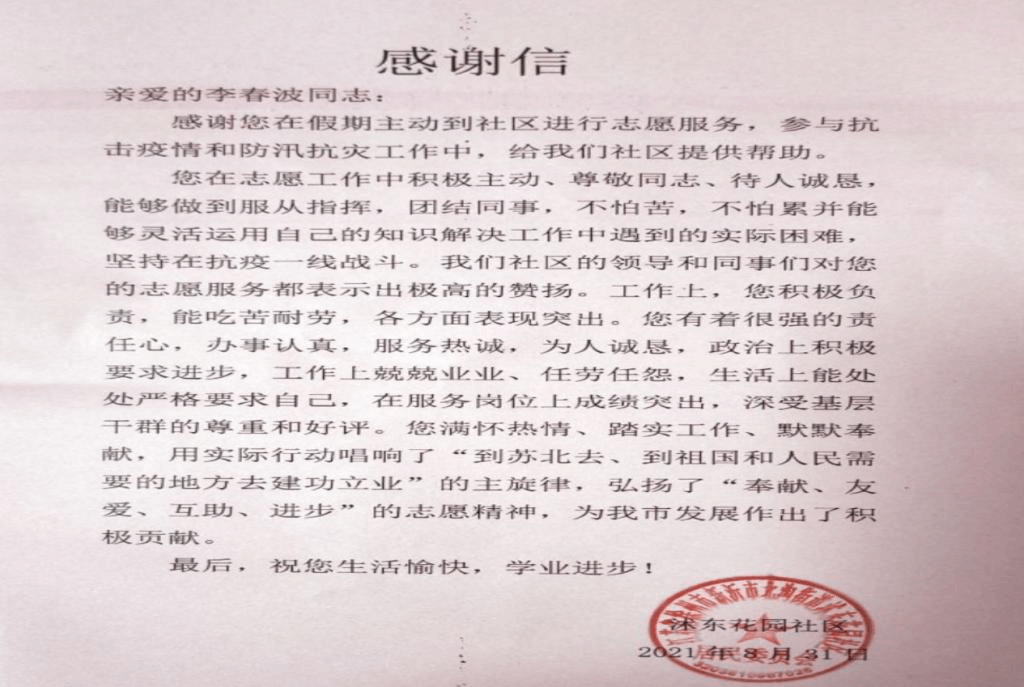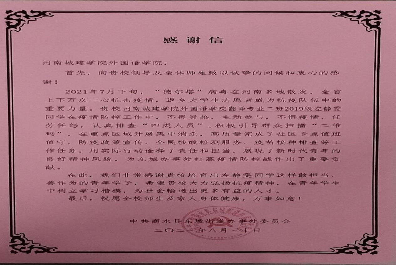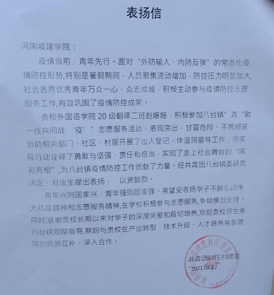(通讯员 于瑞雪 孙巾奥)这个暑假,对于河南省来说是不平凡的,疫情叠加汛情。公司学子利用暑假,积极参与当地防疫抗洪志愿者服务,为家乡做出自己的贡献,用担当书写了最美芳华。一封封感谢信不仅是对公司教育事业的肯定,更彰显了公司学子无私奉献,勇于担当的优秀品质。