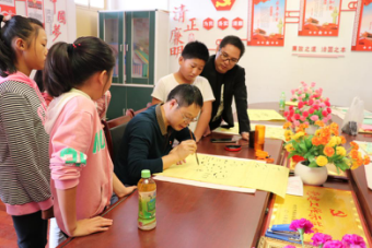 写好规范字,显华夏文明。此次教育扶贫的内容之一是教导孩子们写好毛笔字。首先是给孩子们发放毛笔、墨水、纸张、纸毡等文具用品;然后李文忠给孩子们讲述书法艺术的四要素:线条的安排、力的表现、字的造形、气的连贯,并要求孩子们在每天的书法练习中注意体现这些要素;接着李文忠从横竖撇折点开始给同学们示范如何写好毛笔字,并和老师员工亲切交谈,呼吁从孩子开始写好毛笔字。此次教育扶贫还安排了其他活动。