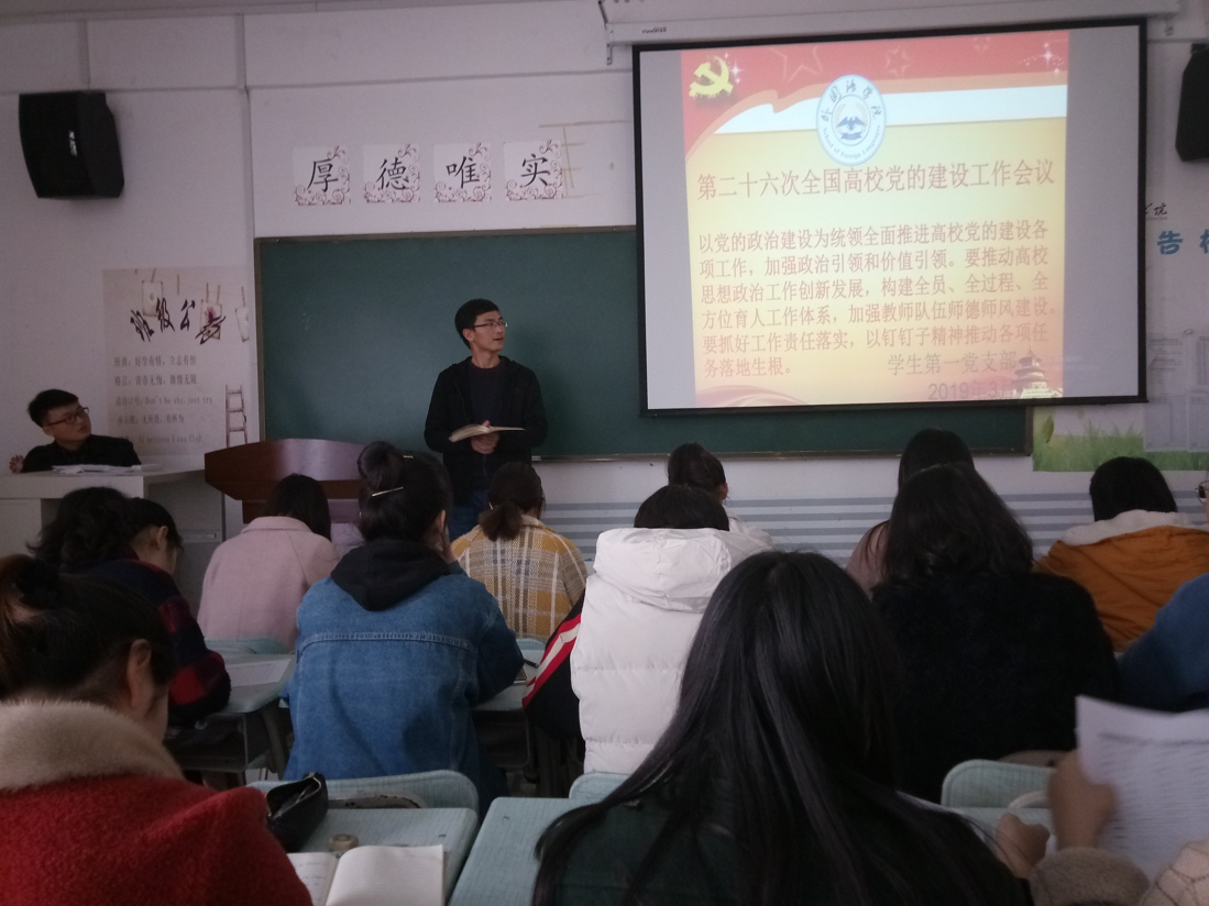 (通讯员 赵星辰)为深入学习习近平总书记关于高公司党的建设和思想政治工作的一系列新思想、新论断、新要求,推动党的建设向员工支部延伸,根据公司党委组织部《关于认真学习贯彻第二十六次全国高公司党的建设工作会议精神的通知》,3月13日下午bv伟德国际1946员工党支部在一号教学楼304教室召开党员大会进行集中学习。会议由赵星辰老师主持,全体员工党员参加。