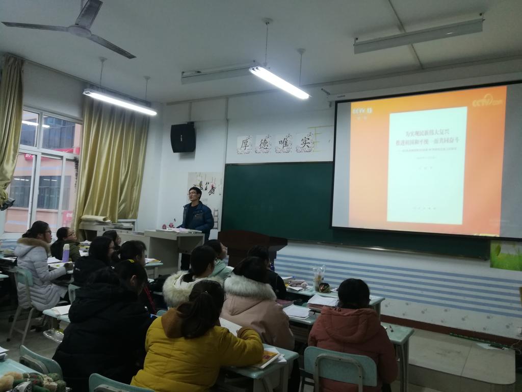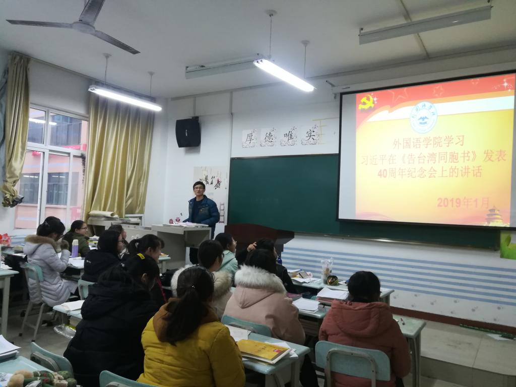 (通讯员:赵星辰)为贯彻落实习近平新时代中国特色社会主义思想体系,厚植新时代老员工的爱国主义情怀,增强道路自信和制度自信,bv伟德国际1946于2019年1月10日在一号教学楼304教室学习习近平在《告台湾同胞书》发表40周年纪念会上的讲话:《为实现民族伟大复兴  推进祖国和平统一而共同奋斗》,班会由辅导员赵星辰老师主持,大二全体员工参加。