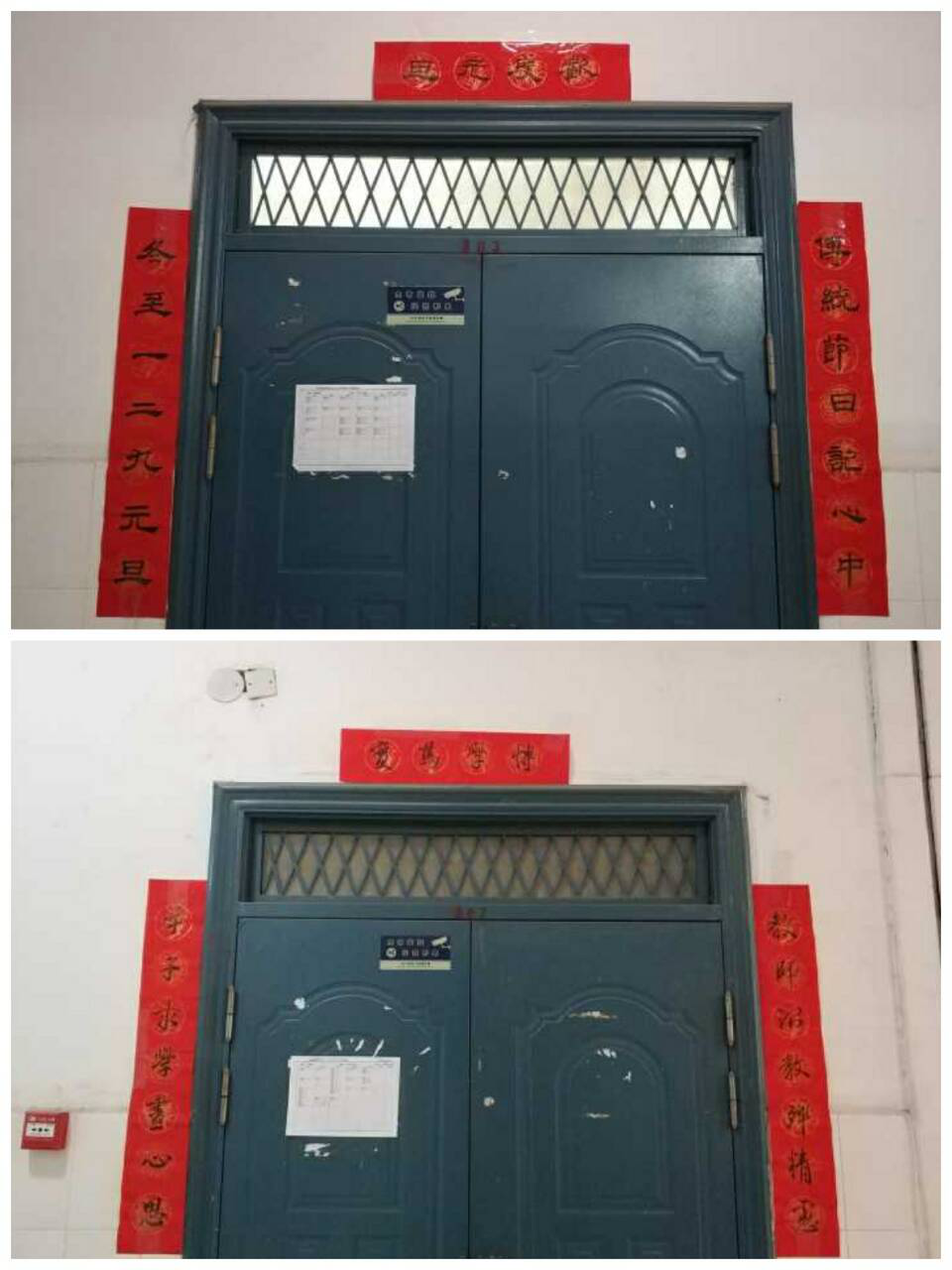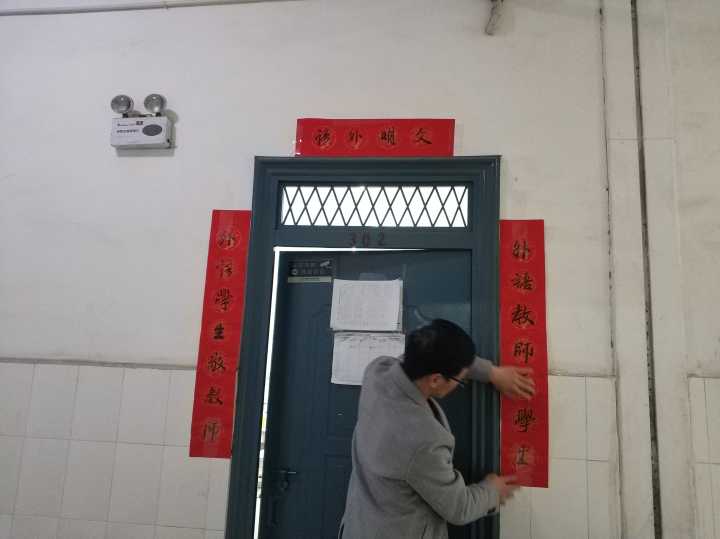 公司师生志愿者协会在节日到来之前就早早地把笔墨纸砚准备齐全。为发扬传统汉字书写文化,元旦当天张凤琴老师组织师生志愿者协会会员工工整整地写好对联。下午赵星辰老师带领志愿者协会会员张贴对联,五副对联分别张贴在不同的教室门口,增添了节日的仪式感和喜庆感。对联贴完之后,同学们纷纷驻足观看,赵星辰老师趁此机会向同学们讲述对联的由来:“对联”又名“门对”、“对子”等,是重大节日(春节、乔迁之日、结婚之时)贴在门上或楹柱上的吉祥语,由上联、下联和横披三部分组成,它是中国一枝独秀的文学形式。特别是春节,家家户户无不贴春联庆贺。鲜红的对联,抒发了人民对新时代幸福生活的向往之情,点缀出一派和谐融洽的节日氛围。