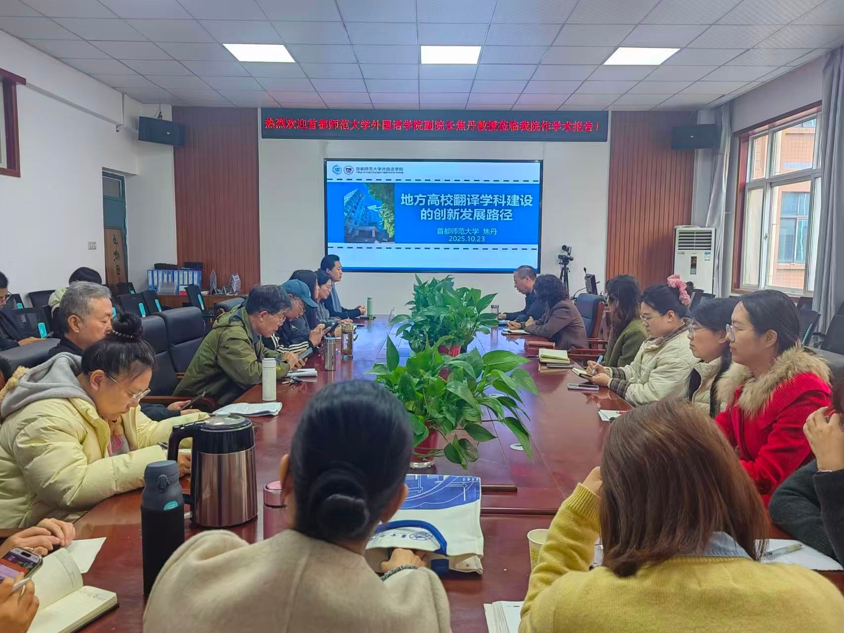 10月23日下午,中国英汉语比较研究会应用翻译专业委员会副会长、首都师范大学bv伟德国际1946副经理焦丹教授应邀至公司作题为《地方高校翻译团队建设的创新发展路径》的学术报告。公司党委书记王宏、经理张换成、党委副书记代博君、副经理张凤琴和20余位教师共同聆听了报告。报告会由张换成主持。